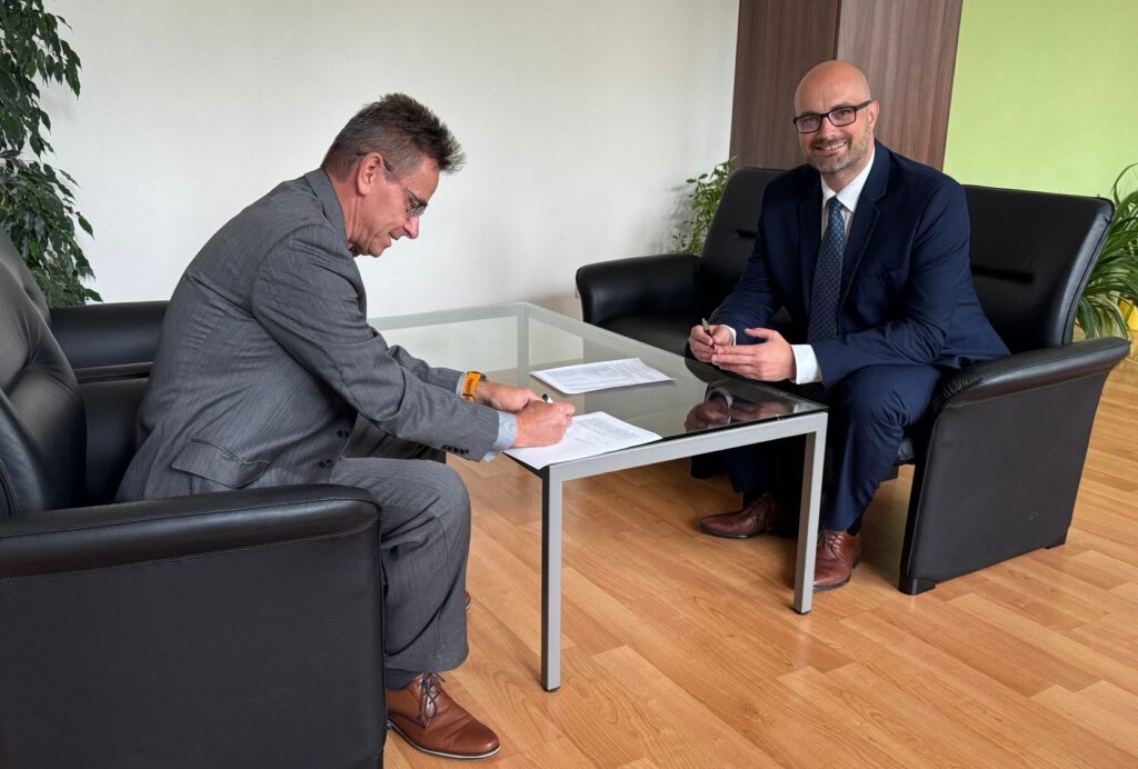 Podpis dohody mezi univerzitou a M.A.S. Automation. Vlevo předseda představenstva M.A.S. Automation Ing. Michael Ondraschek, vpravo děkan Fakulty elektrotechniky a informatiky Univerzity Pardubice prof. Ing. Petr Doležel, Ph.D.